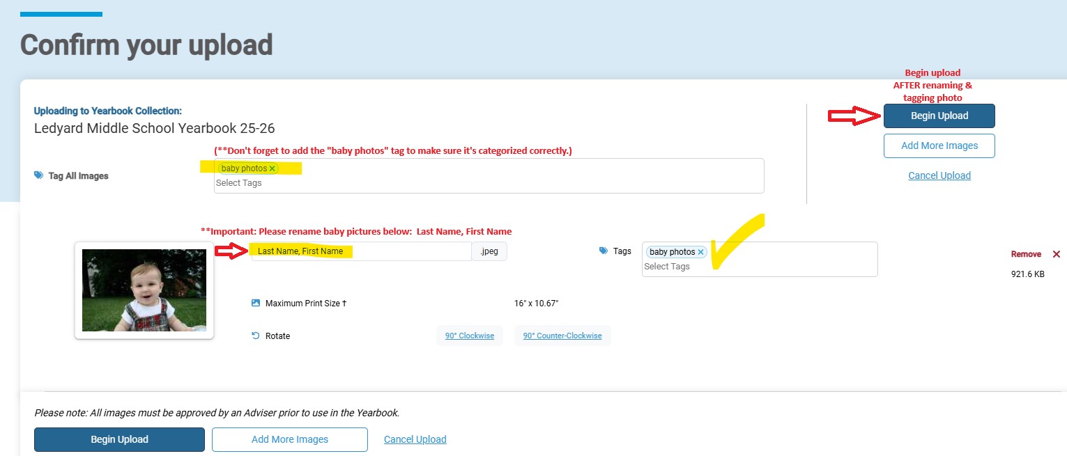 The yearbook would like to dedicate a few pages to 8th grade baby pics. If you would like to submit a baby pic, please follow the directions below. I've also included a screenshot with directions to help you upload the picture to Lifetouch. (Be sure to use the tag "baby photos" and include your child's name - if not, I won't know who is in the photo. Please take a look at the pic below for further directions.)